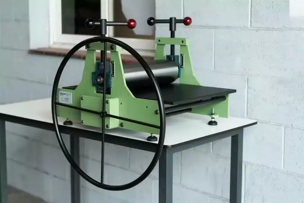 El Premier 40 es un tórculo de sobremesa compacto, diseñado para ofrecer una opción eficiente sin comprometer la calidad del grabado. Con una platina de HPL de 12 mm de espesor y dimensiones de 400 x 600 mm, permite un grabado máximo de 400 x 450 mm, ideal para proyectos artísticos en espacios reducidos.